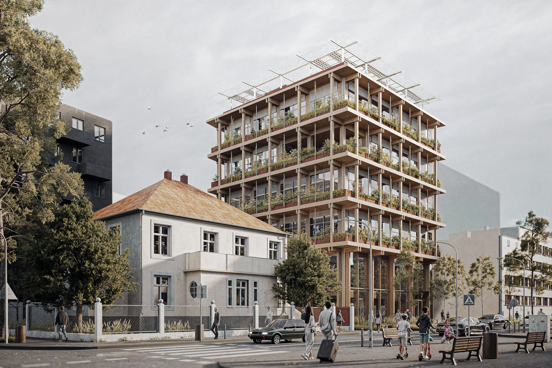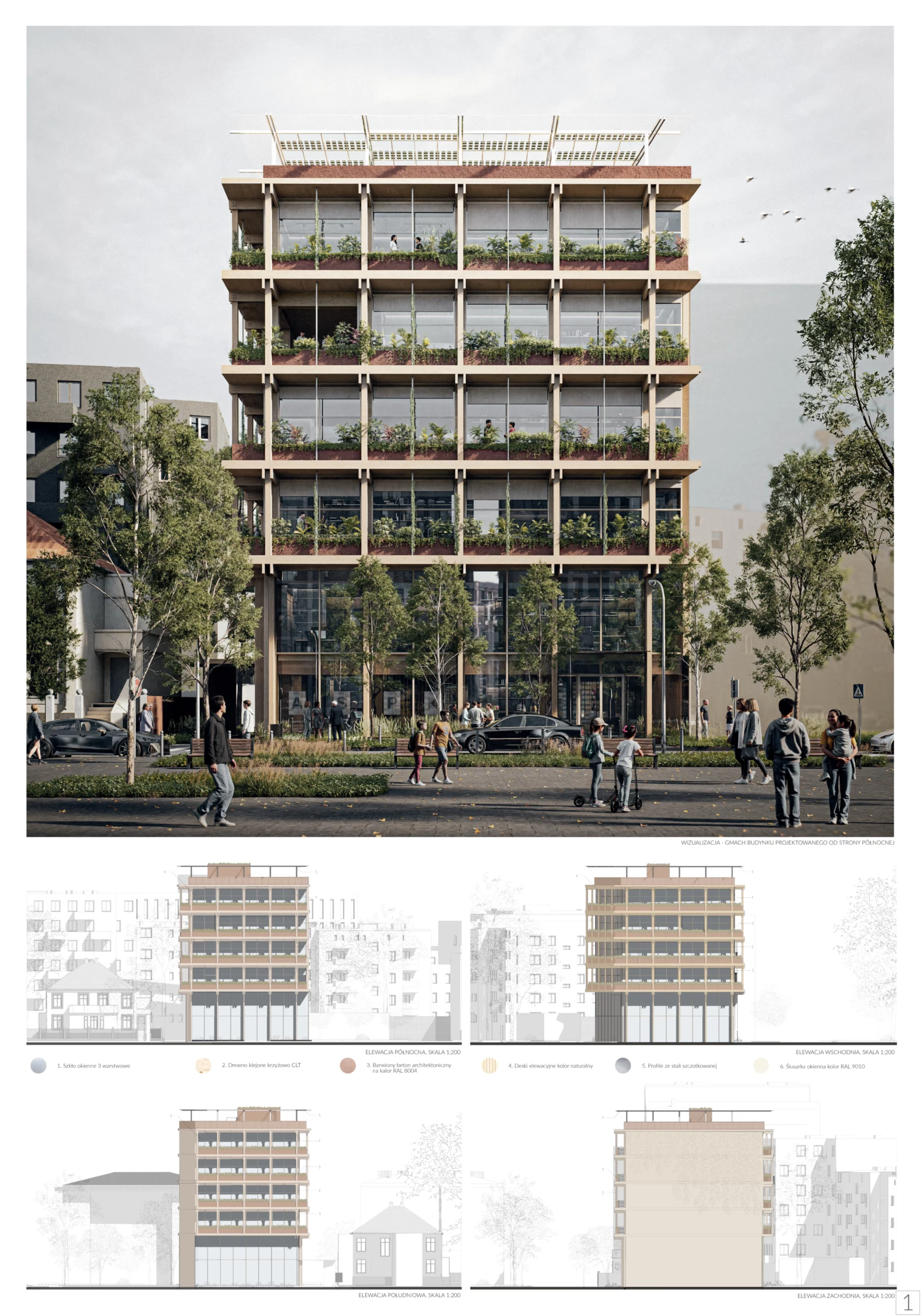 Założenie przewiduje sześciokondygnacyjny obiekt o zwartej bryle, harmonijnie wpisany w pierzeję ul. Raciborskiej. Elewacja nawiązuje do skali sąsiedniej zabudowy – parter i pierwsze piętro utrzymują wysokość i linię gzymsu sąsiadującej willi, wyższe kondygnacje kontynuują pionowy rytm, uzupełniony balkonami z betonowymi donicami pełniącymi funkcję zieleni wertykalnej.