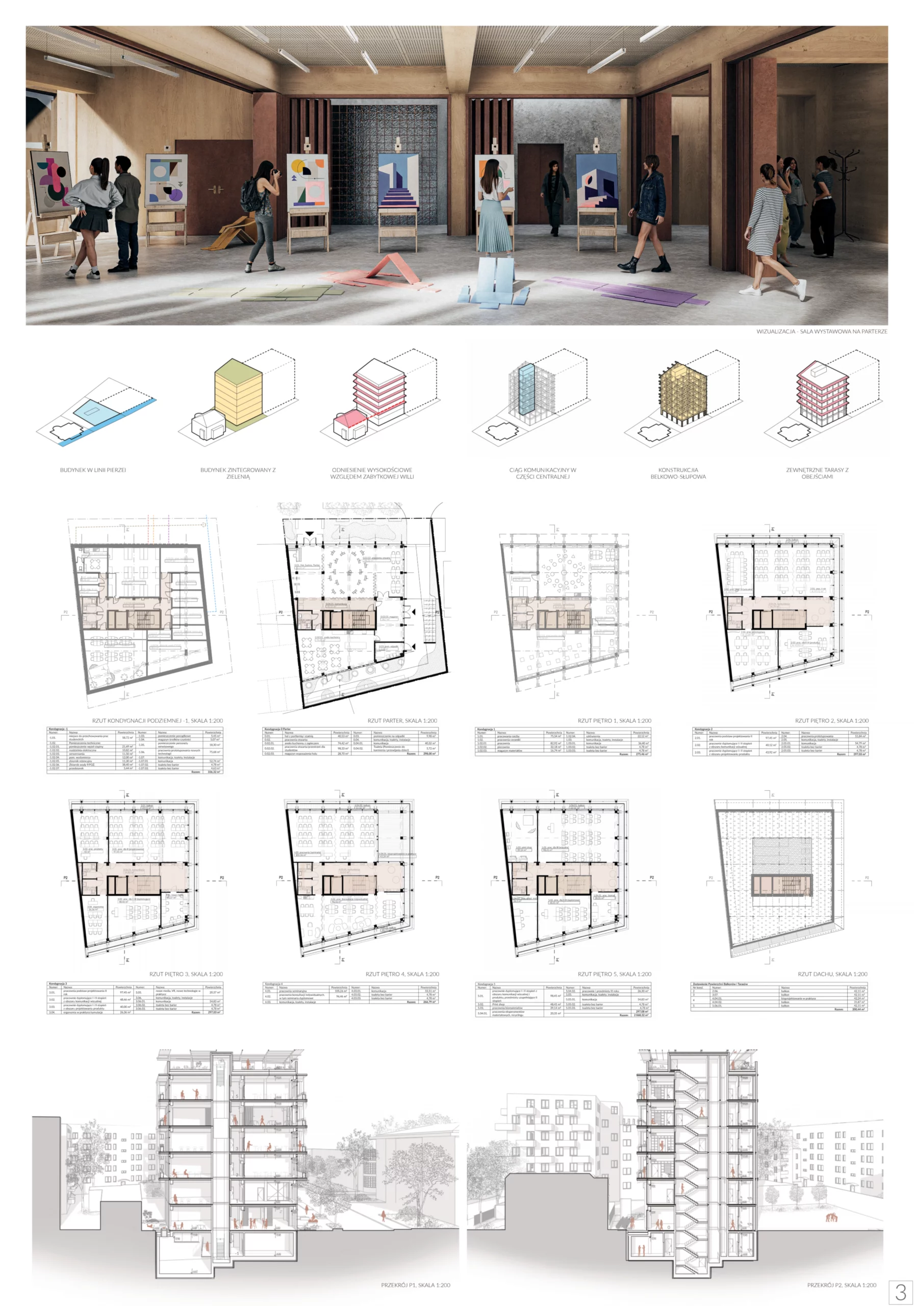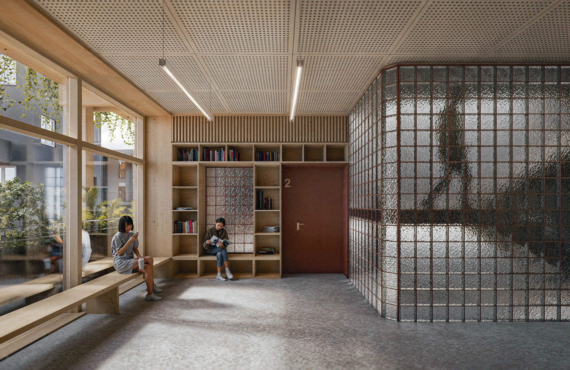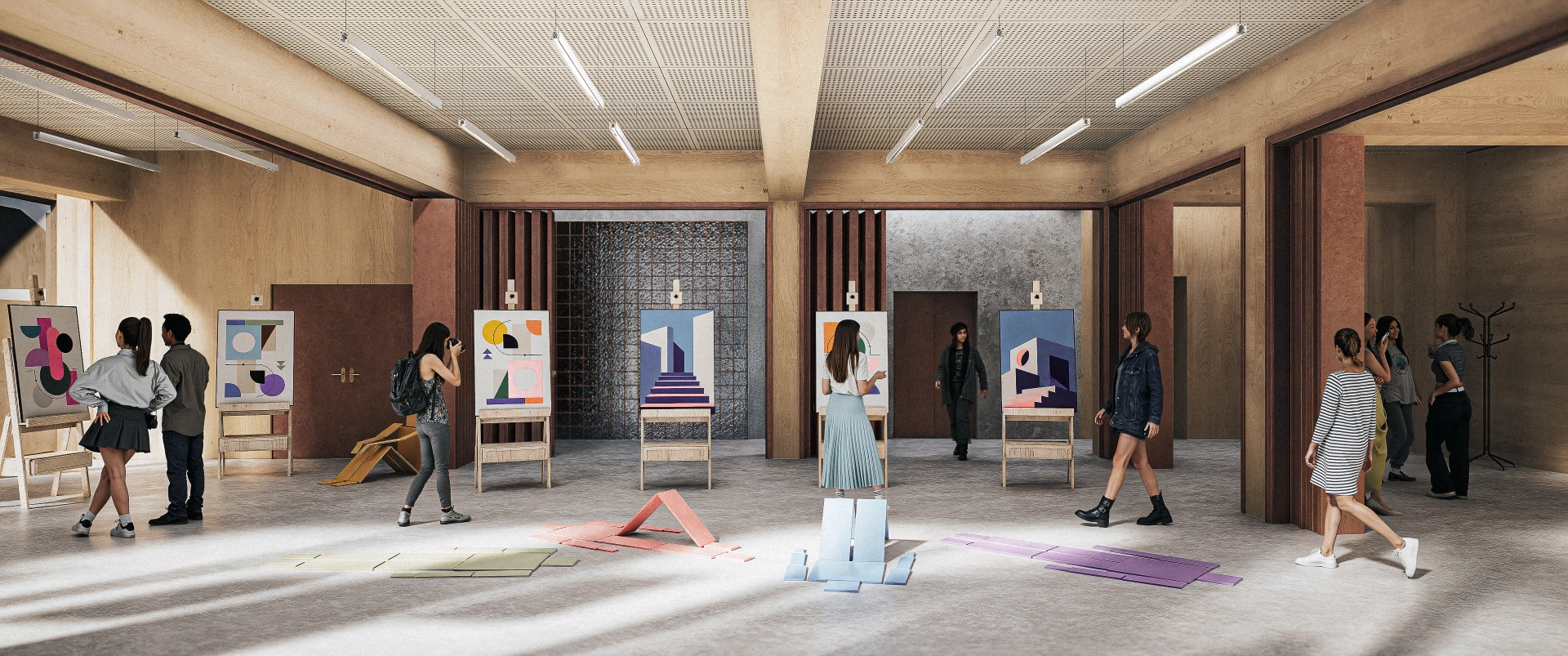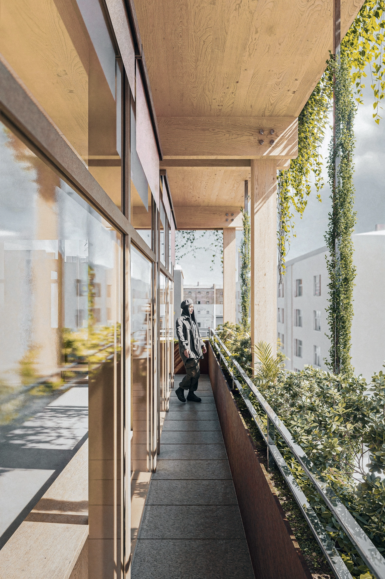 Układ funkcjonalny oparto na trzech strefach: północnej (sale wykładowe), centralnej (klatka schodowa i piony instalacyjne) oraz południowej (jasne pracownie i przestrzenie wspólne). Wnętrza zaplanowano w technologii prefabrykowanych paneli CLT, co zmniejsza ślad węglowy i umożliwia elastyczną aranżację. Widoczne drewno poprawia dobrostan użytkowników, a kolorystyka balkonów nawiązuje do ceglanej zabudowy historycznej.