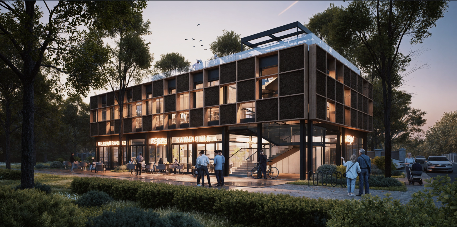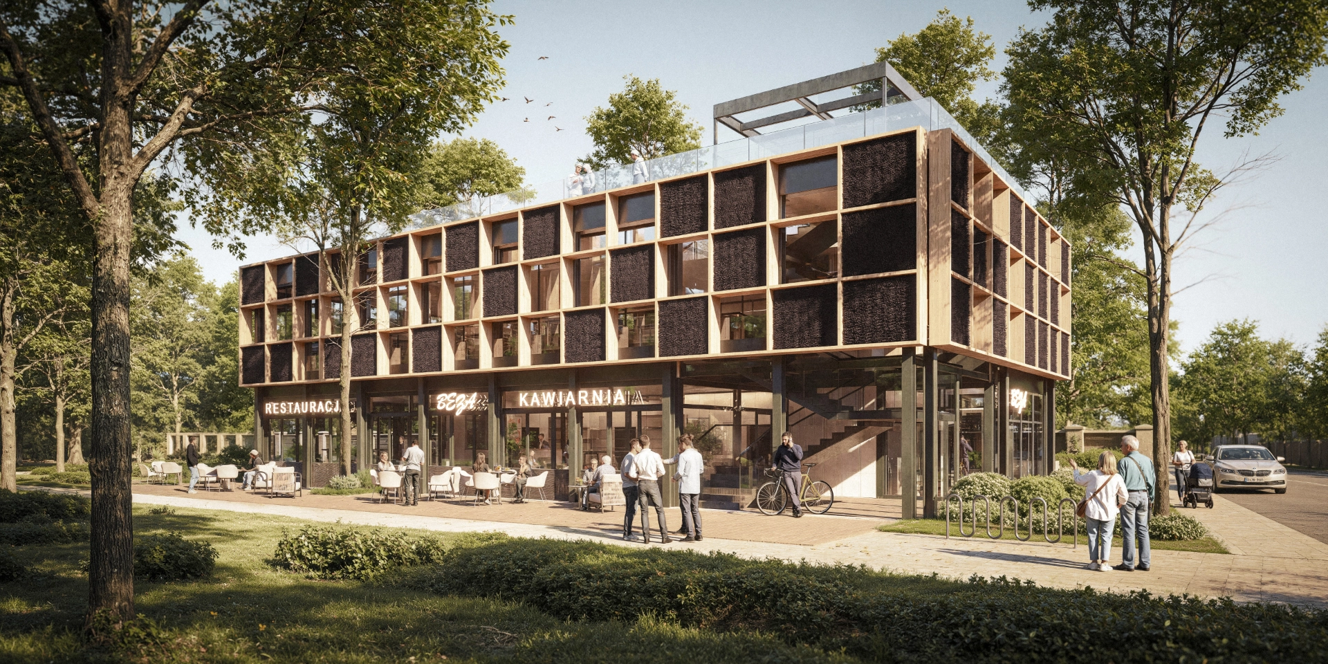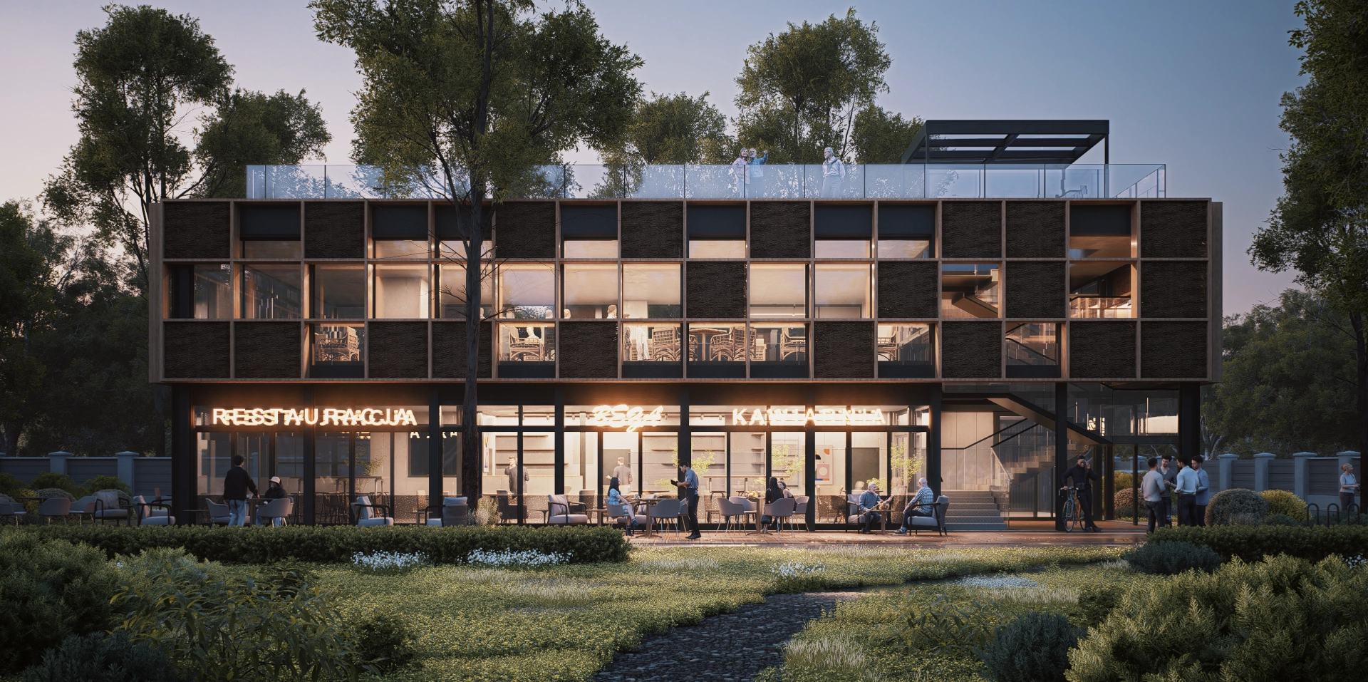 Założeniem projektu było stworzenie nadbudowy, która harmonijnie połączy się z istniejącą strukturą, podnosząc jednocześnie walory estetyczne i funkcjonalne obiektu. Kontrast pomiędzy przeszklonym parterem a bardziej zamkniętym, geometrycznym piętrem podkreśla nową kompozycję budynku i tworzy nowoczesną, czytelną bryłę. Zrównoważone proporcje, powtarzalny rytm drewnianych podziałów elewacji oraz subtelne operowanie światłem i cieniem nadają jej elegancki charakter.