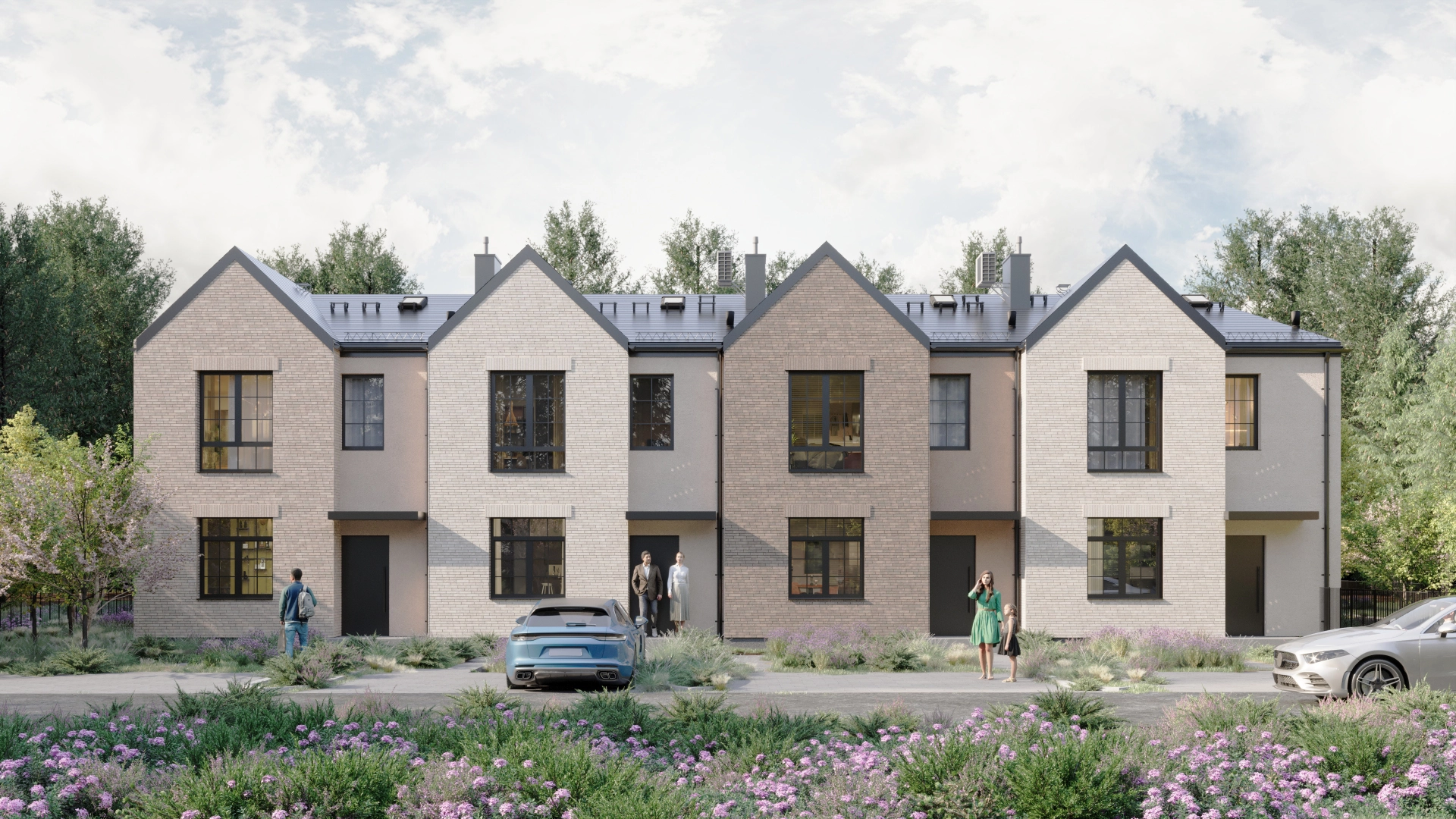Osiedle składa się z 8 domów w zabudowie bliźniaczej, każdy z indywidualnym charakterem. Minimalistyczna forma budynków, w połączeniu z dużymi przeszkleniami oraz eleganckimi ceglanymi wykończeniami, wprowadza do wnętrz obfitość światła i poczucie lekkości. Ta ponadczasowa estetyka tworzy przestrzeń gotową do osobistej aranżacji, która z biegiem lat będzie zachwycać swoją elegancją.