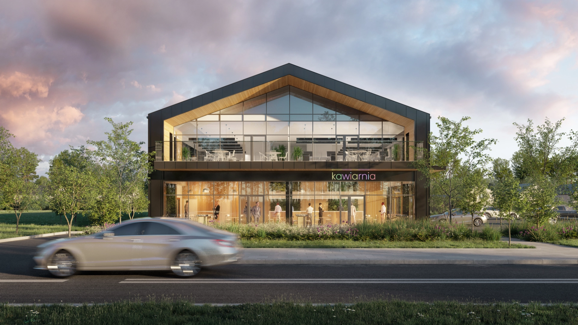 Architektura budynku handlowo-usługowego charakteryzuje się nowoczesnym i wyrazistym stylem. Wyrazisty dach o delikatnym nachyleniu oraz eleganckie połączenie ciemnej elewacji z dużymi przeszkleniami parteru tworzą czytelną i zapraszającą bryłę. Projekt fasady zapewnia maksymalną ekspozycję dla lokali handlowych, co jest kluczowe dla ich sukcesu. Przemyślany układ pozwala na swobodny dostęp i widoczność dla wszystkich najemców.