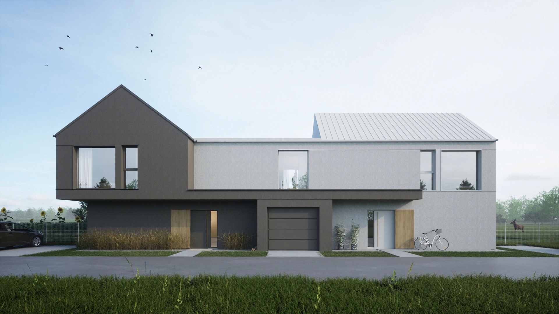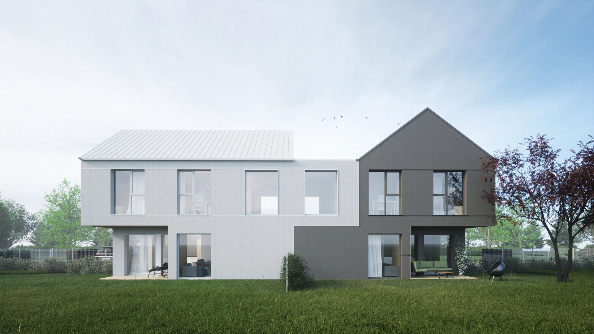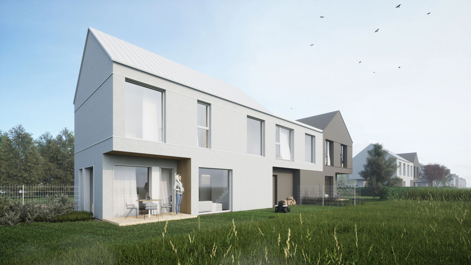Domy w zabudowie bliźniaczej wyróżniają się prostą, geometryczną formą oraz dużymi przeszkleniami, które zapewniają dostęp światła dziennego i otwierają wnętrza na ogród. Układy funkcjonalne zostały starannie zaplanowane – przestronne strefy dzienne na parterze sprzyjają wspólnemu życiu rodzinnemu, a piętro oferuje komfortowe sypialnie oraz przestrzeń prywatną. Garaże w bryle budynku podnoszą komfort użytkowania.