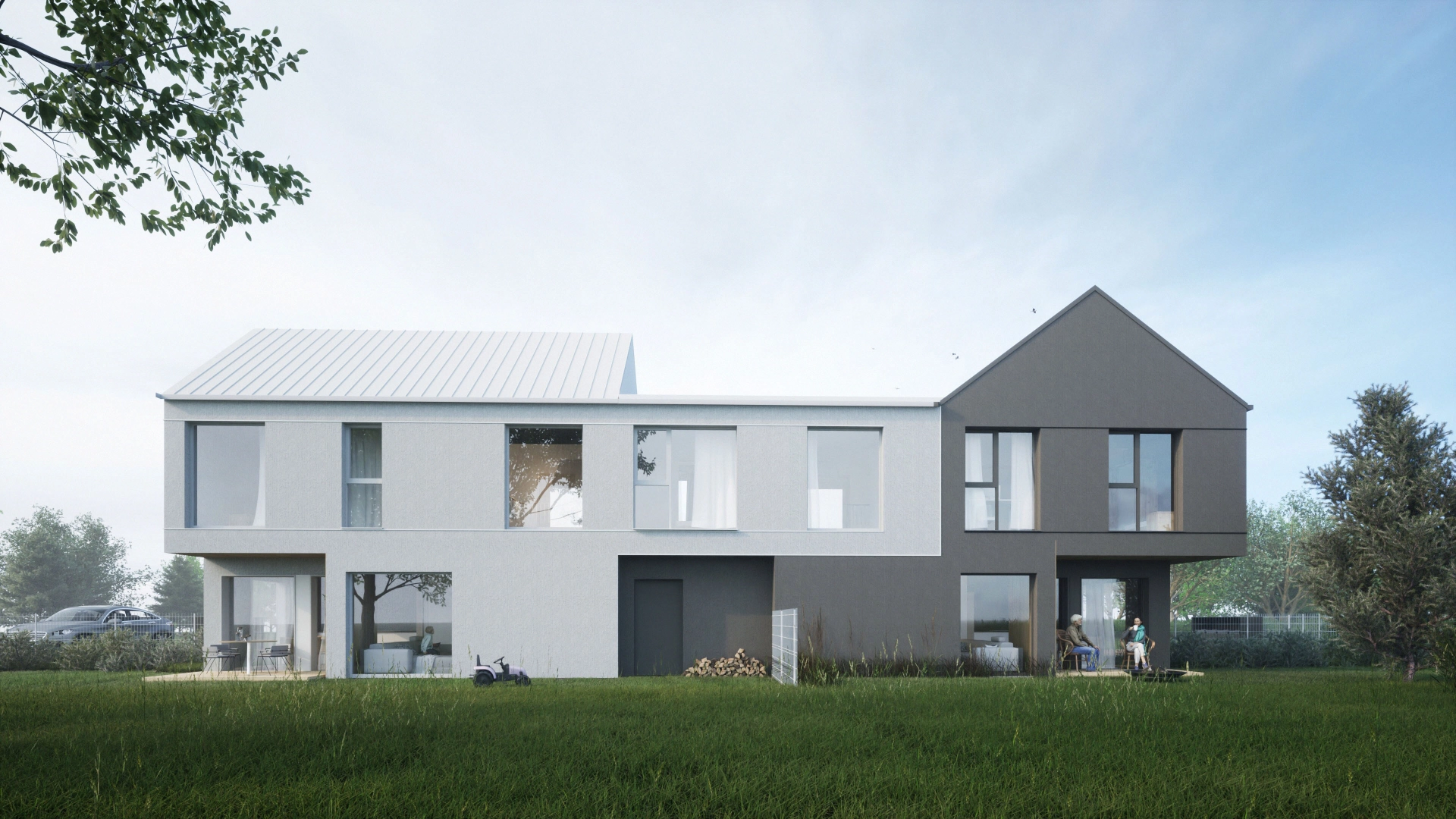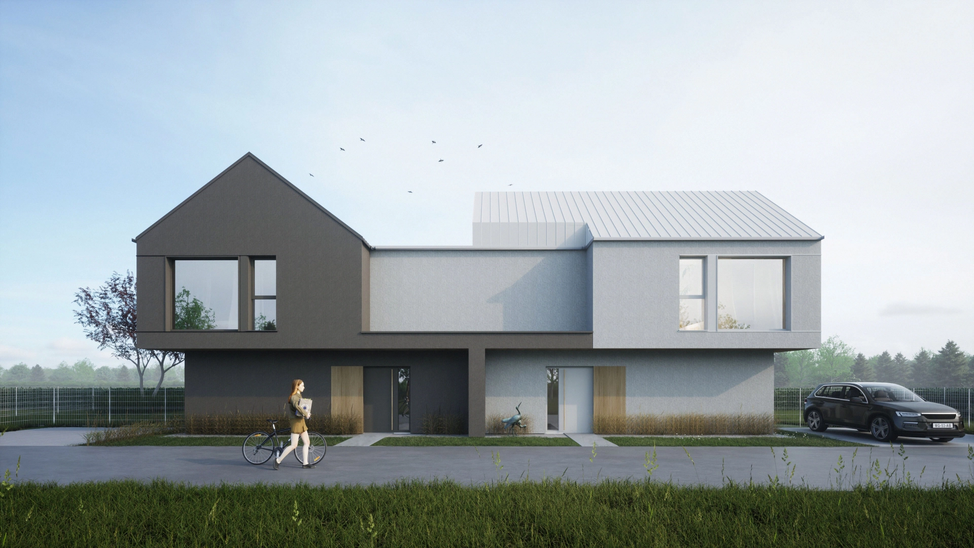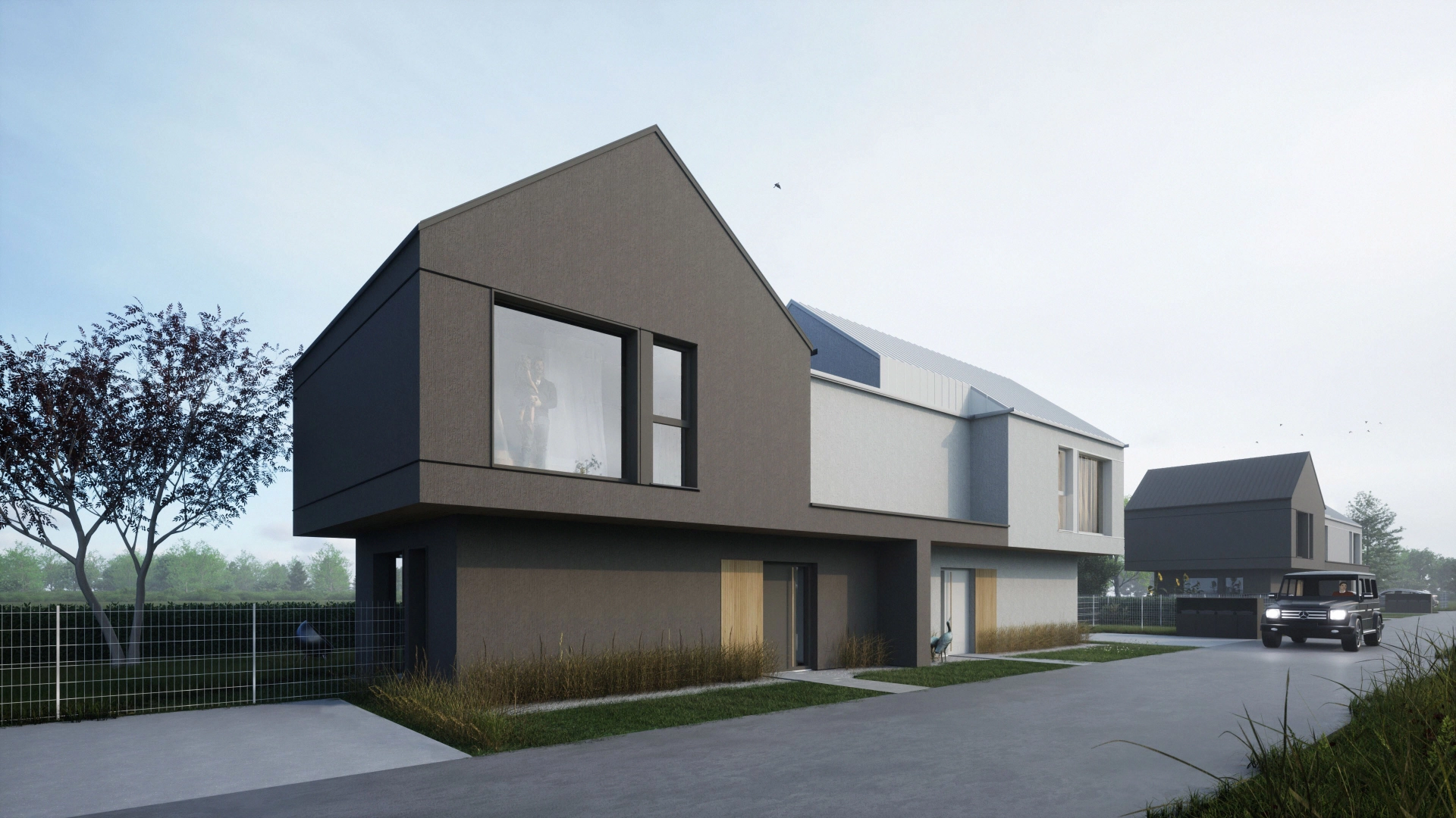 Domy w zabudowie bliźniaczej wyróżniają się prostą, geometryczną formą oraz dużymi przeszkleniami, które zapewniają dostęp światła dziennego i otwierają wnętrza na ogród. Układy funkcjonalne zostały starannie zaplanowane – przestronne strefy dzienne na parterze sprzyjają wspólnemu życiu rodzinnemu, a piętro oferuje komfortowe sypialnie oraz przestrzeń prywatną. Garaże w bryle budynku podnoszą komfort użytkowania.